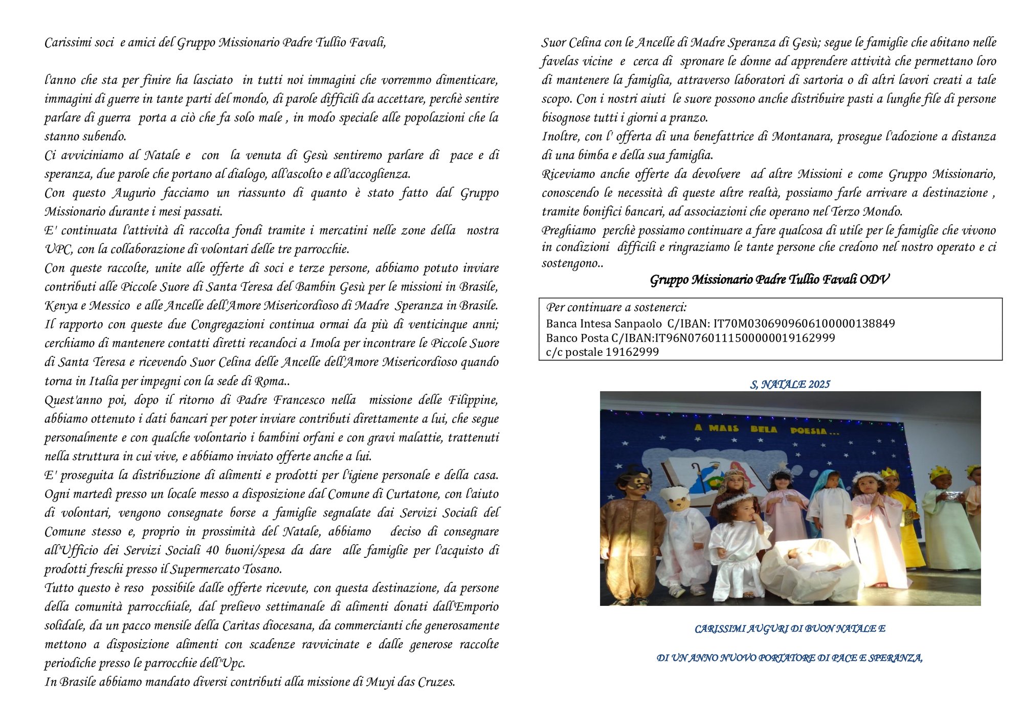 Carissimi soci e amici del Gruppo Missionario Padre Tullio Favali anche quest'anno abbiamo pensato di unire agli Auguri qualche notizia sull'attività della nostra Associazione, dal momento che non abbiamo avuto altre occasioni per farlo durante l'anno.