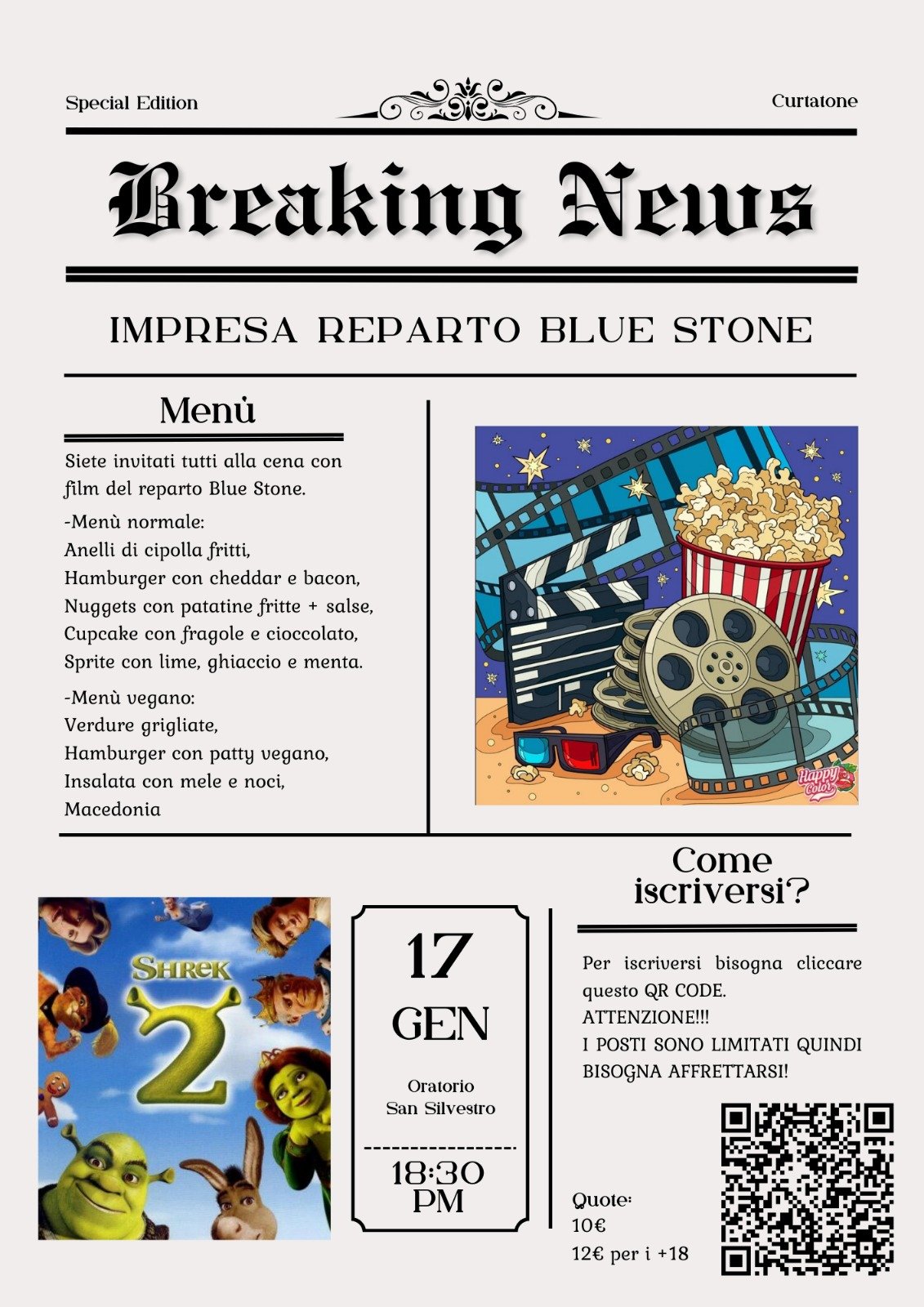 Sabato 17 gennaio non prendere impegni: l’Impresa Reparto Blue Stone ti invita a una serata imperdibile tra cinema e buon cibo. 🎬🍔